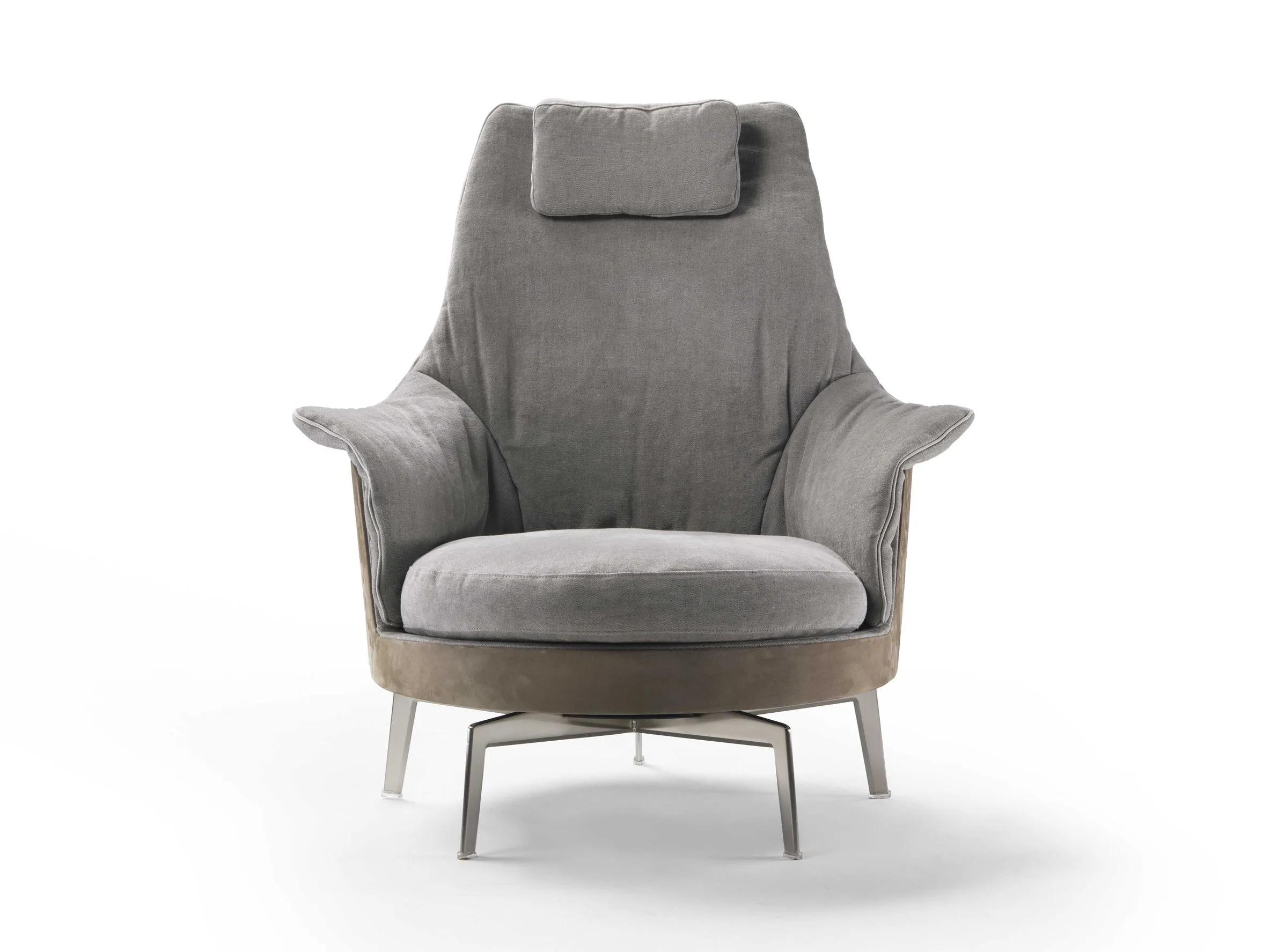 Guscioalto é uma poltrona bergère especialmente confortável, com encosto alto, conhecida pelo seu acabamento de alta costura. A estrutura é uma concha envolvente feita de espuma de poliuretano estrutural, enquanto a almofada do assento é em penas de ganso com um núcleo em material resistente ao esmagamento. Para garantir o máximo conforto, a versão Guscioalto Soft vem com acolchoamento adicional no encosto do assento e uma camada extra de Dacron e espuma viscoelástica. Para uma experiência de assento extraordinariamente confortável, a Guscioalto Light apresenta um elemento estofado contornado exclusivo – com estofamento facilmente removível e lavável – que se prende ao encosto com velcro. As poltronas Guscioalto vêm com uma base leve e despojada – giratória ou não giratória – com pernas de metal, baseada em um design exclusivo da Flexform e disponível em diferentes acabamentos. Também estão disponíveis numa versão com base e pernas em madeira maciça, disponíveis em várias tonalidades.
