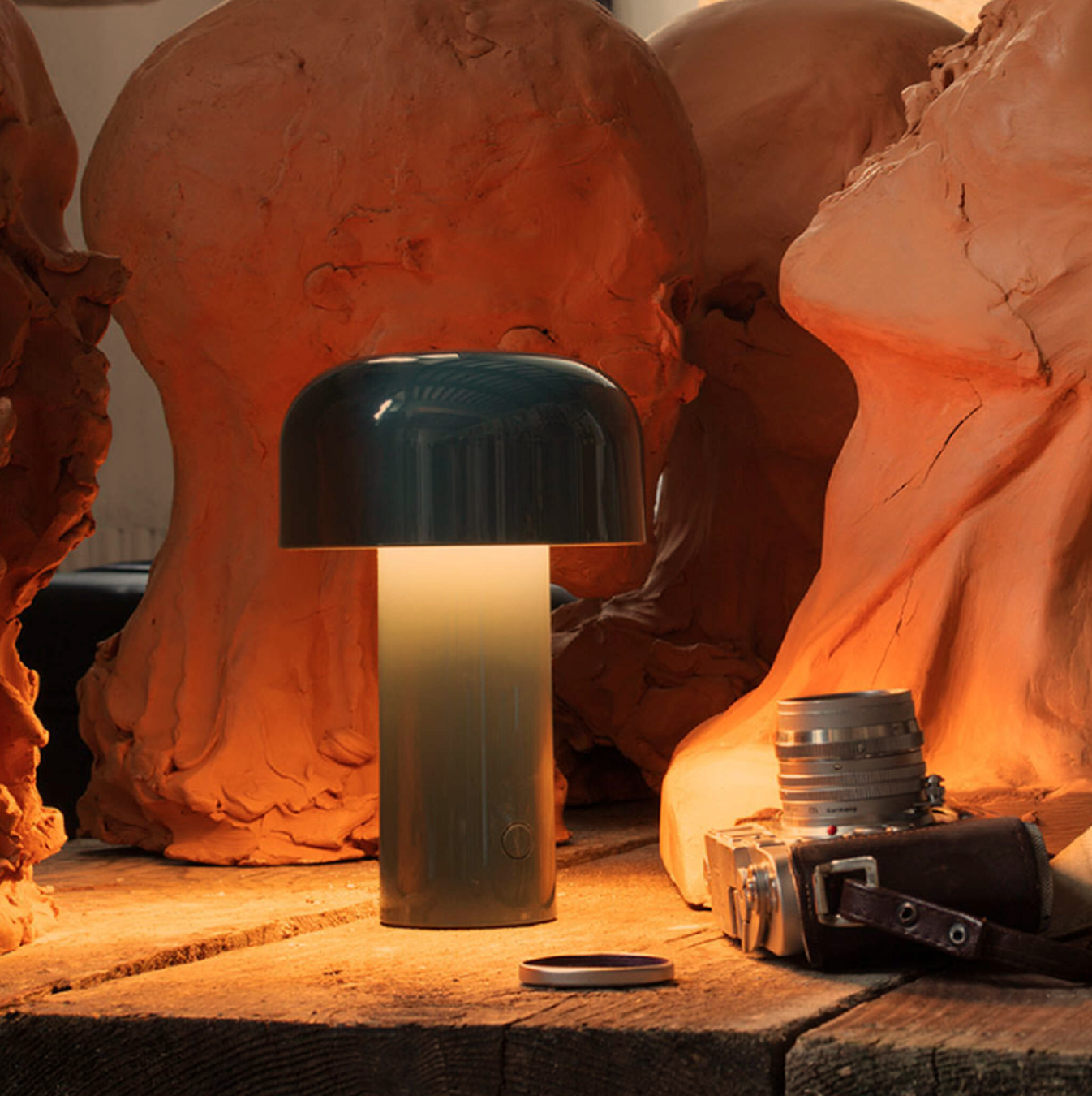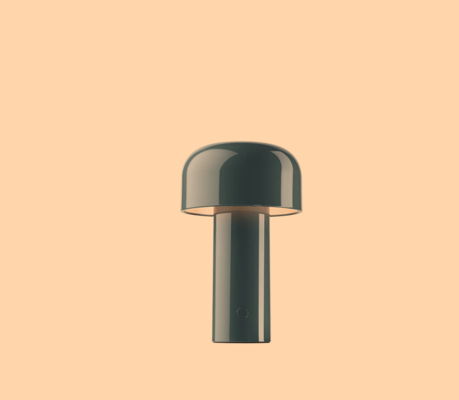 Bellhop by Flos is a rechargeable table lamp with direct light. Its base and cap are made of colored PC, and its diffuser is made of engraved opal PC molded by injection. The lamp has a battery life of up to 24 hours and is charged via Micro-USB-C. The switch button on the base allows for 4 levels of adjustment. A battery status indicator is located under the base. The USB-C charging cable included in the package has a useful length of 120 cm, while the USB battery charger has interchangeable plugs.