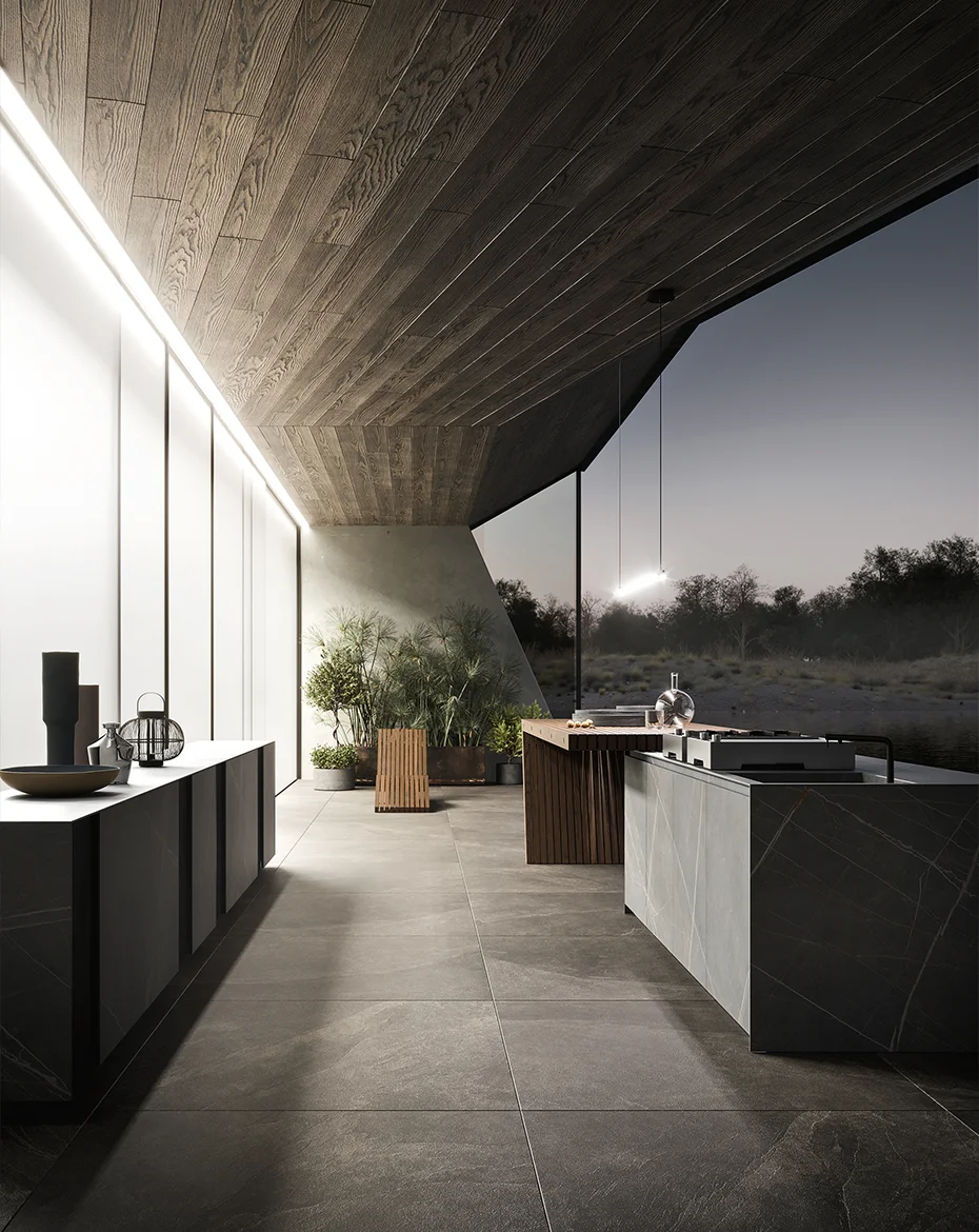 Project 04 by Modulnova is part of the Skill Gres outdoor collection, defined by pure architectural volumes and refined materiality. The system features ultra-thin stoneware surfaces (only 6 mm) applied to fronts, sides and worktops, creating a visually light yet structurally solid composition.