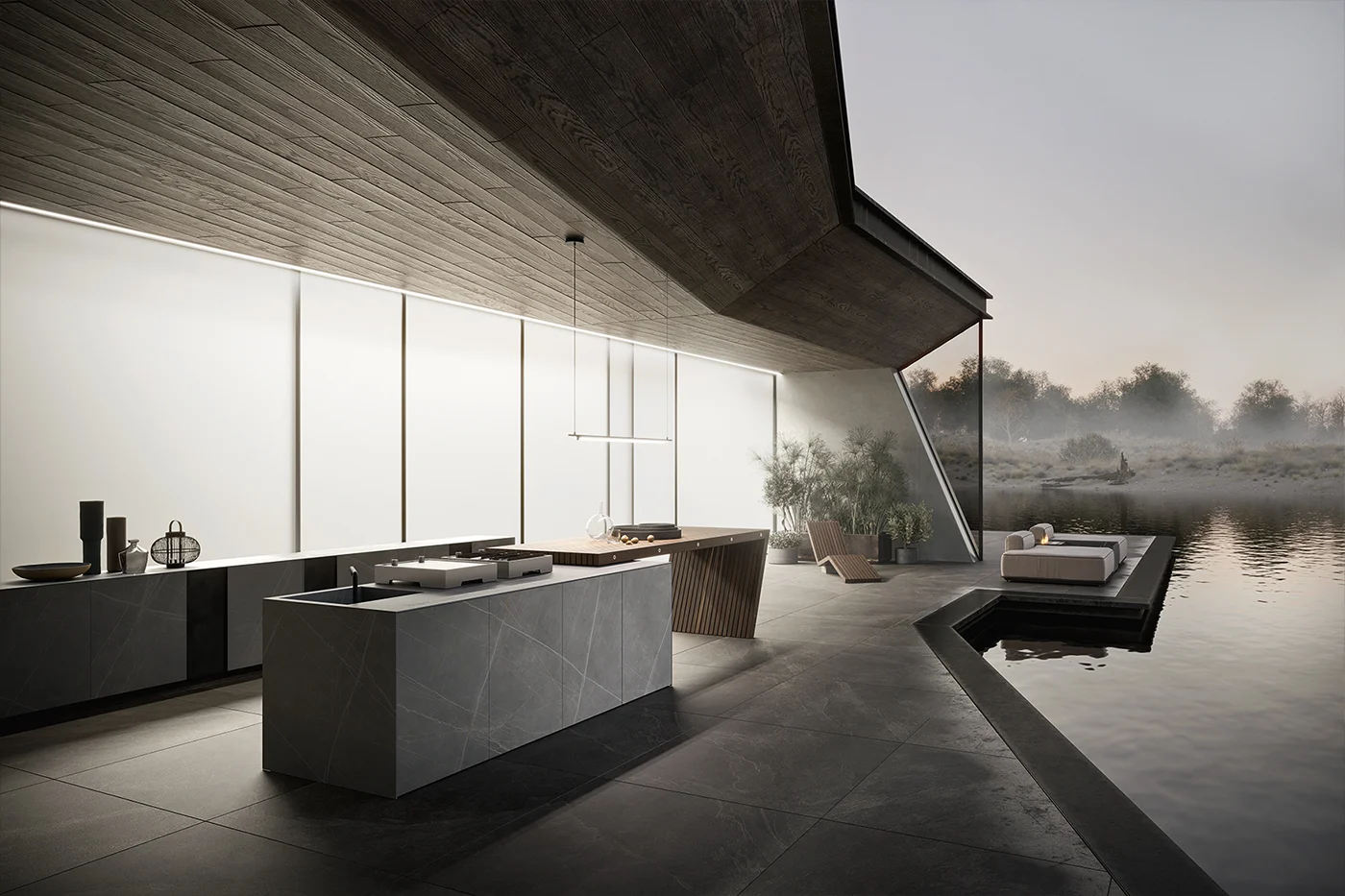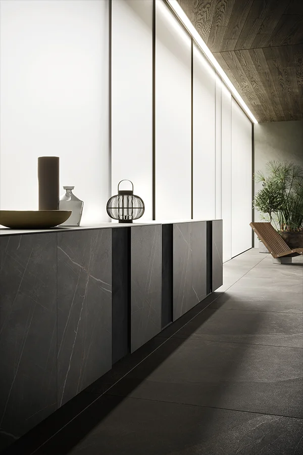 The composition can be completed with additional elements such as the Madia Sipario storage unit in matching stoneware and Black Dust metal, as well as the XY peninsula in thermo-treated ash wood, creating a balanced dialogue between mineral and natural materials.