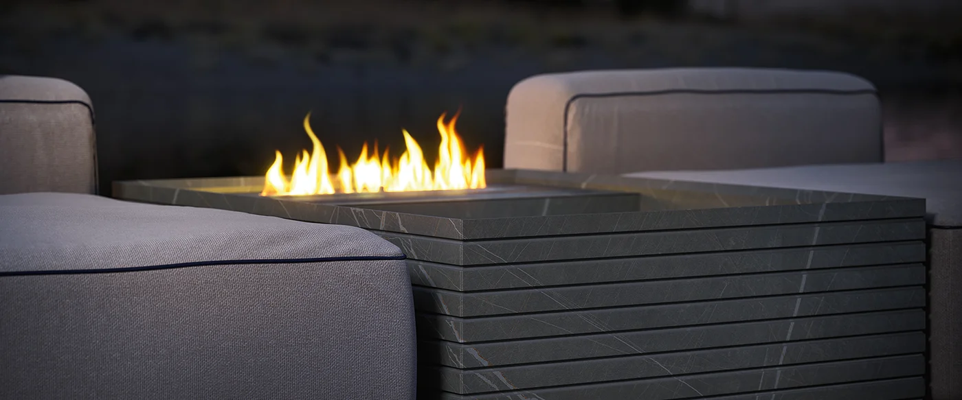 A complementary Block side table with a bioethanol hearth adds a functional and atmospheric dimension, transforming the kitchen into a complete outdoor living environment.