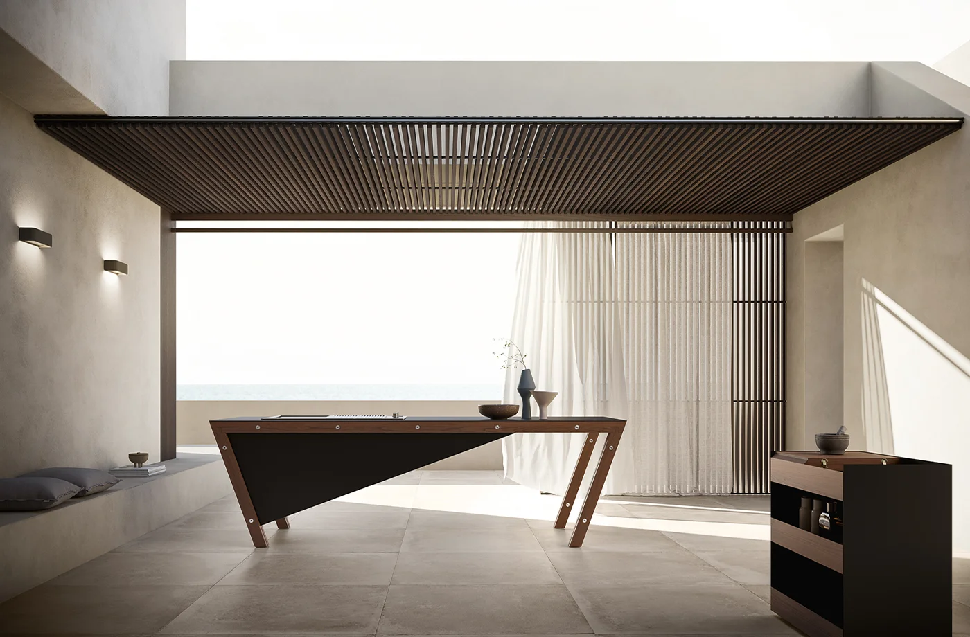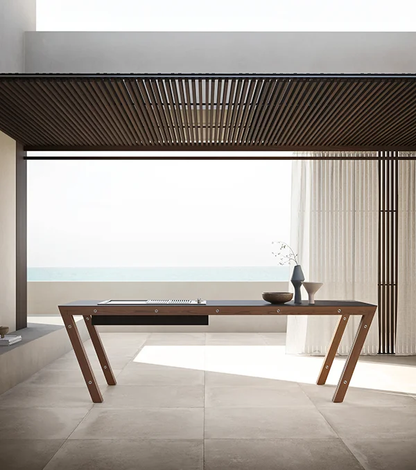 A distinctive element of Project 07 is the OPEN trolley on retractable wheels, designed as a functional extension of the kitchen. Featuring a stainless steel structure with thermo-treated ash panels, it offers customizable compartments with materials such as wood, stoneware, marble or stainless steel.