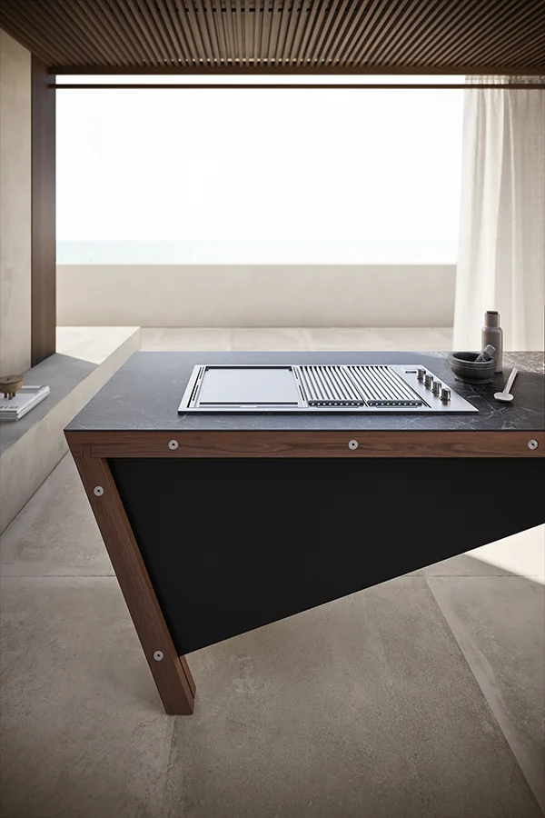 The worktop is finished in Nero Greco stoneware (12 mm thick) and integrates a cooktop in stainless steel, ensuring durability and resistance to outdoor conditions. The system includes a Blade panel to conceal the gas tank compartment, maintaining a clean architectural look.
