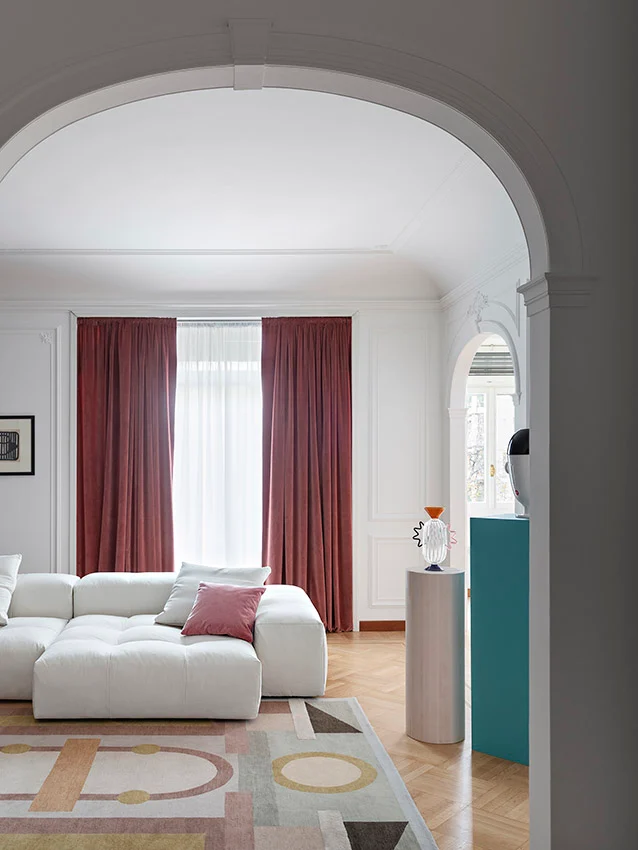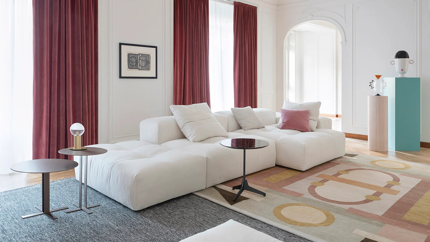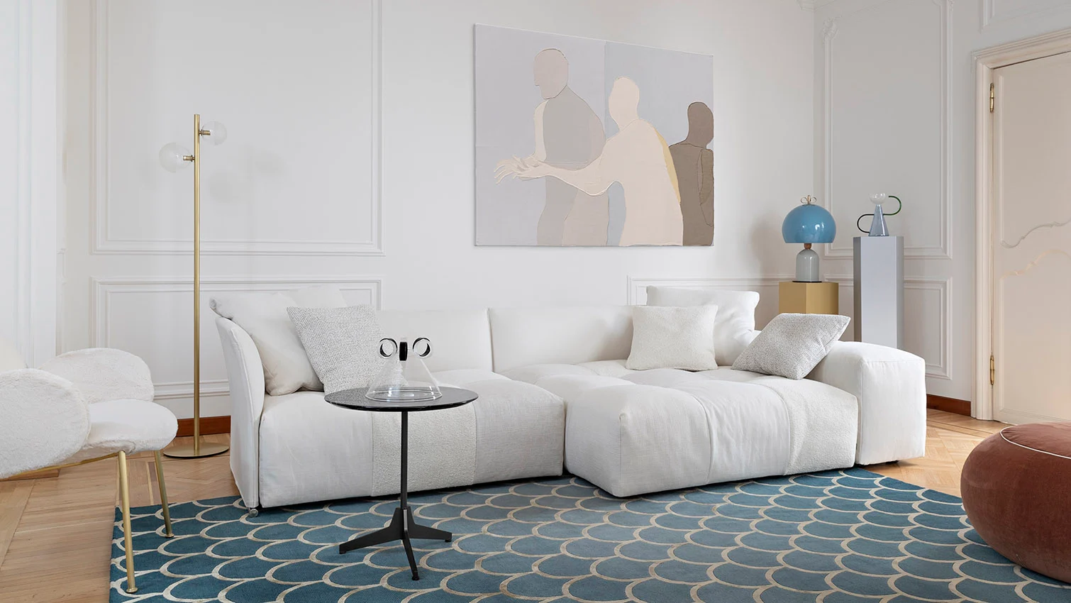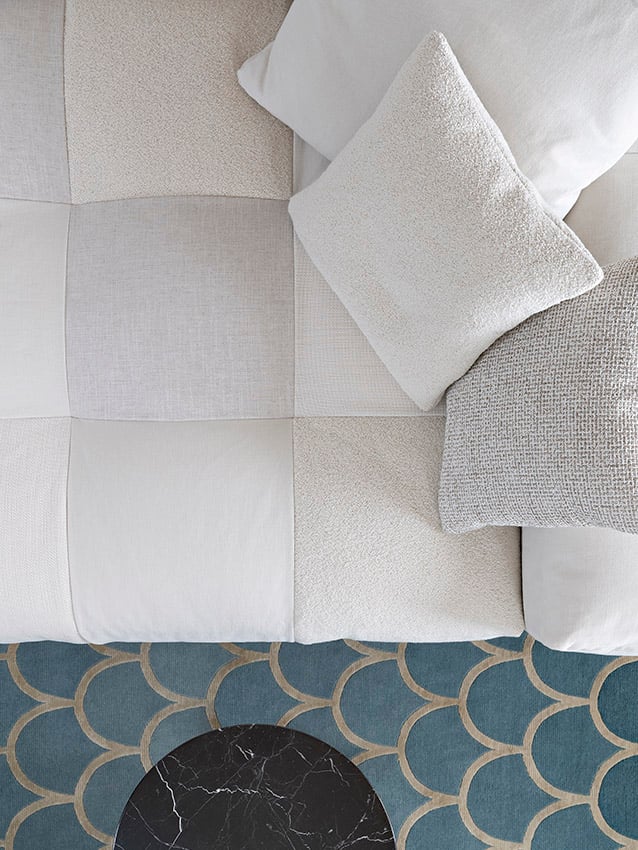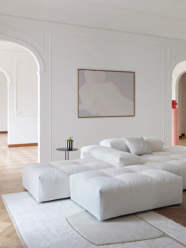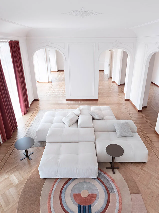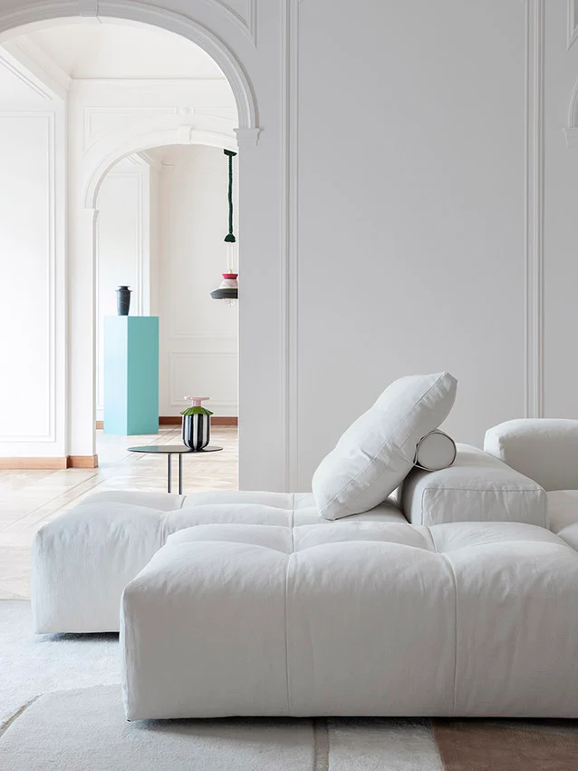 As almofadas do assento, acolchoadas com penas, podem ser estofadas com uma capa em patchwork, realçando as possibilidades ilimitadas de personalização ao escolher um sofá Saba. Graças à forma particular das costas e dos apoios para os braços, o tamanho total do sofá é reduzido, tanto em termos de largura como de profundidade, sem comprometer a sua estética.