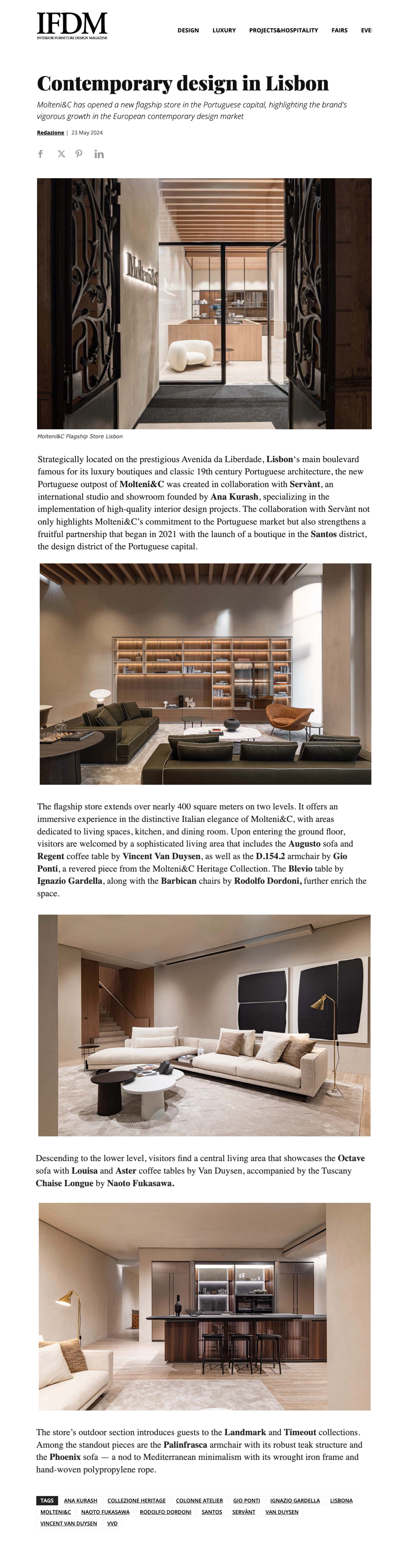 The opening of the first Molteni&C flagship store in Portugal was covered by IFDM, a significant trade magazine for the design sector. Representing the best in luxury and designer furniture and décor, IFDM brings professionals together within a collaborative context. It is a key source for trends and new industry developments, divided into three publications: IFDM Magazine, Projects & Hospitality Book, and IFDM.design.
