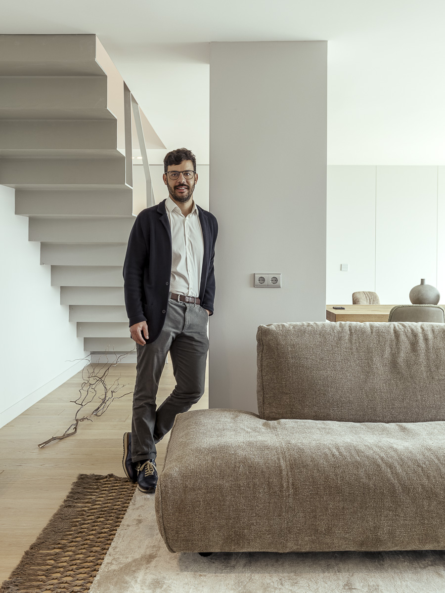 The foundation of the living area is the large rug from the Italian brand Baxter, with its softness and artisanal details. Integrating authentic and contemporary pieces, like Frigerio`s woven ropes and warm wooden curves, along with artisanal objects from 101 Copenhagen, contributes to a cozy atmosphere.