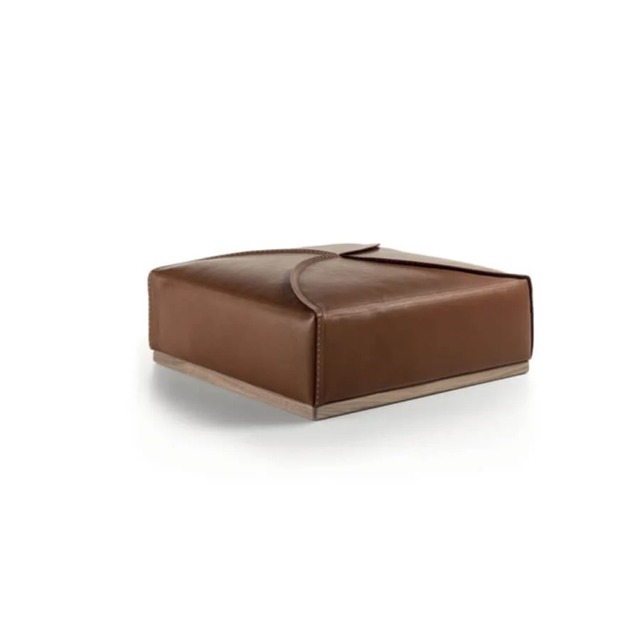 The Helix pouf, with a base in solid wood and squared shape, is the result of the technical mastery of the Frigerio craftsmen who cut and manipulated the leather to give it the shape and the appearance of a sheet of paper, which folds and fits together like an origami.