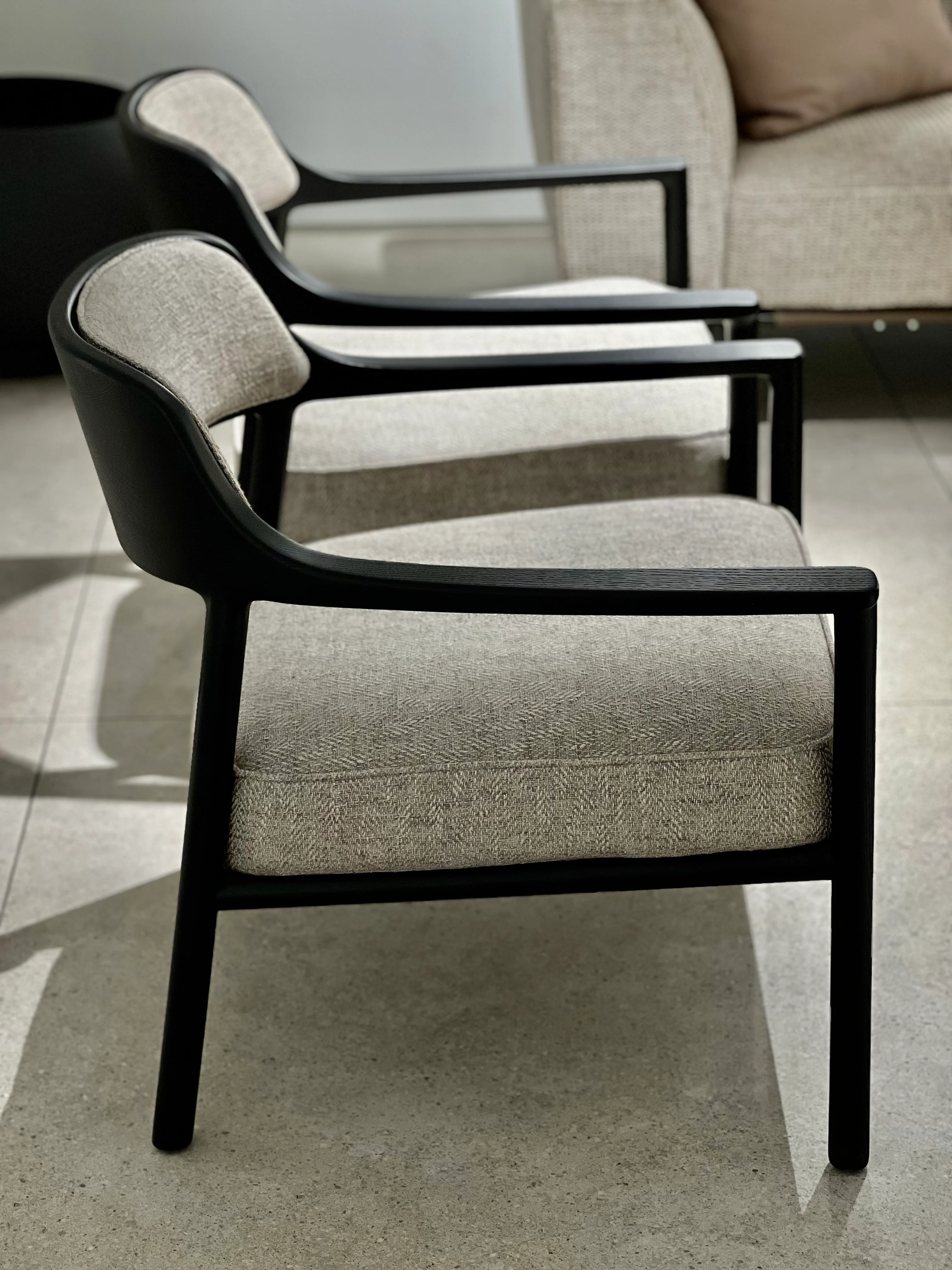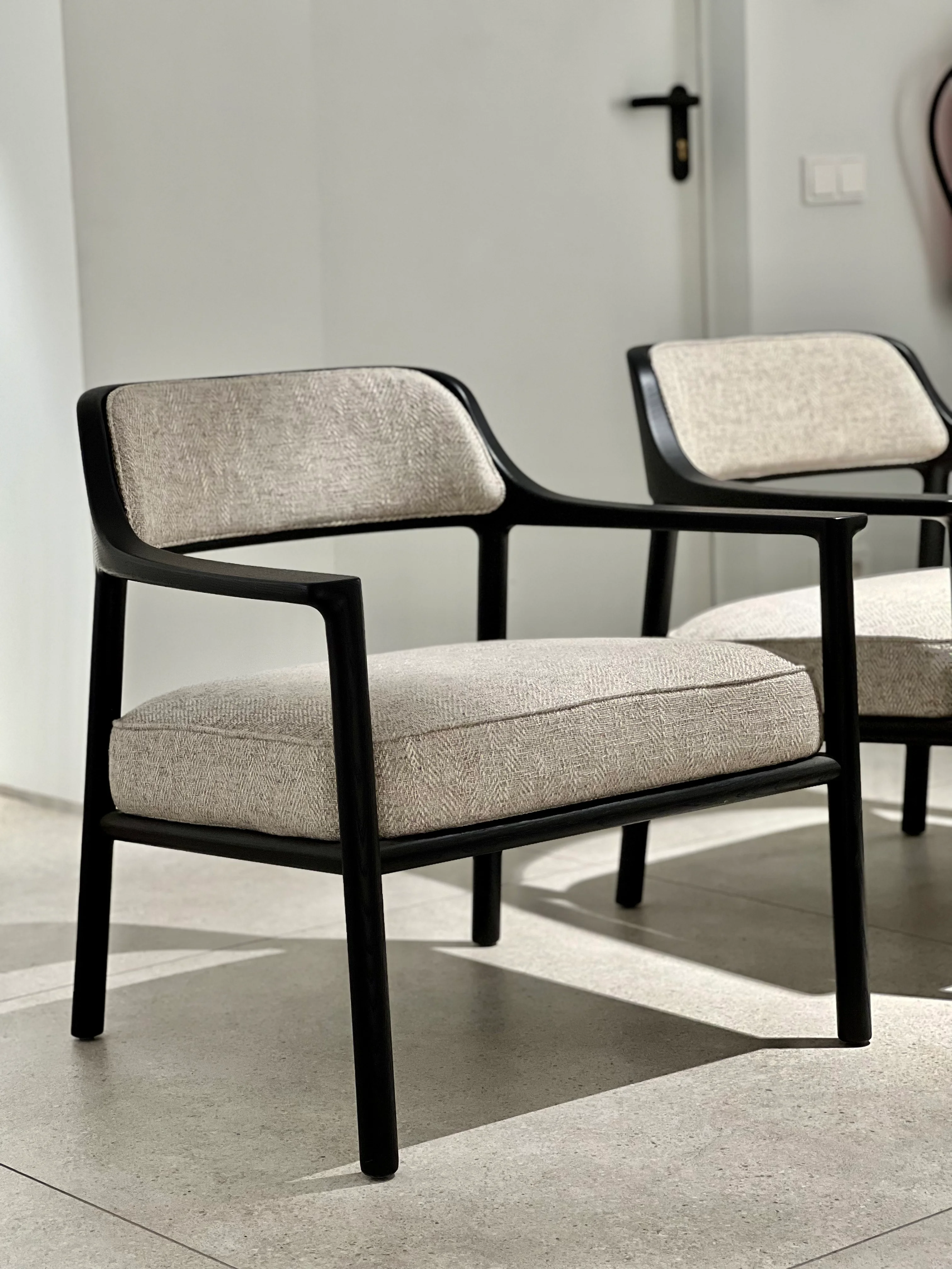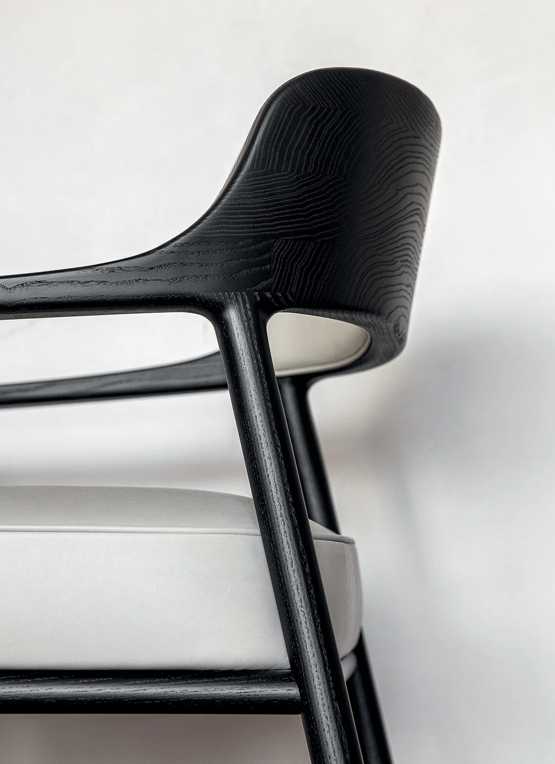 This armchair with a frame made entirely of solid ash, stained as black oak or eucalyptus, where the backrest is all one with the armrests.