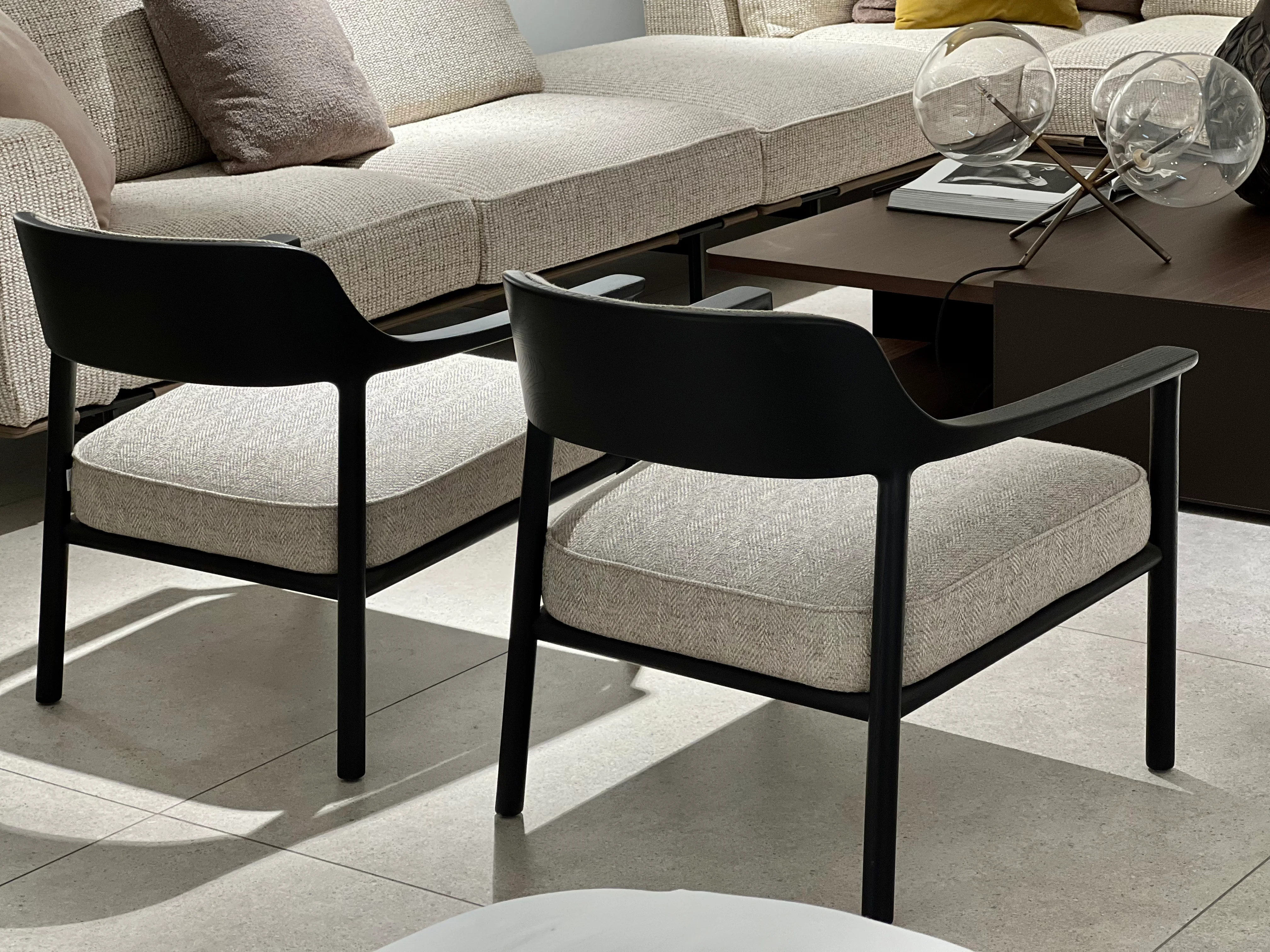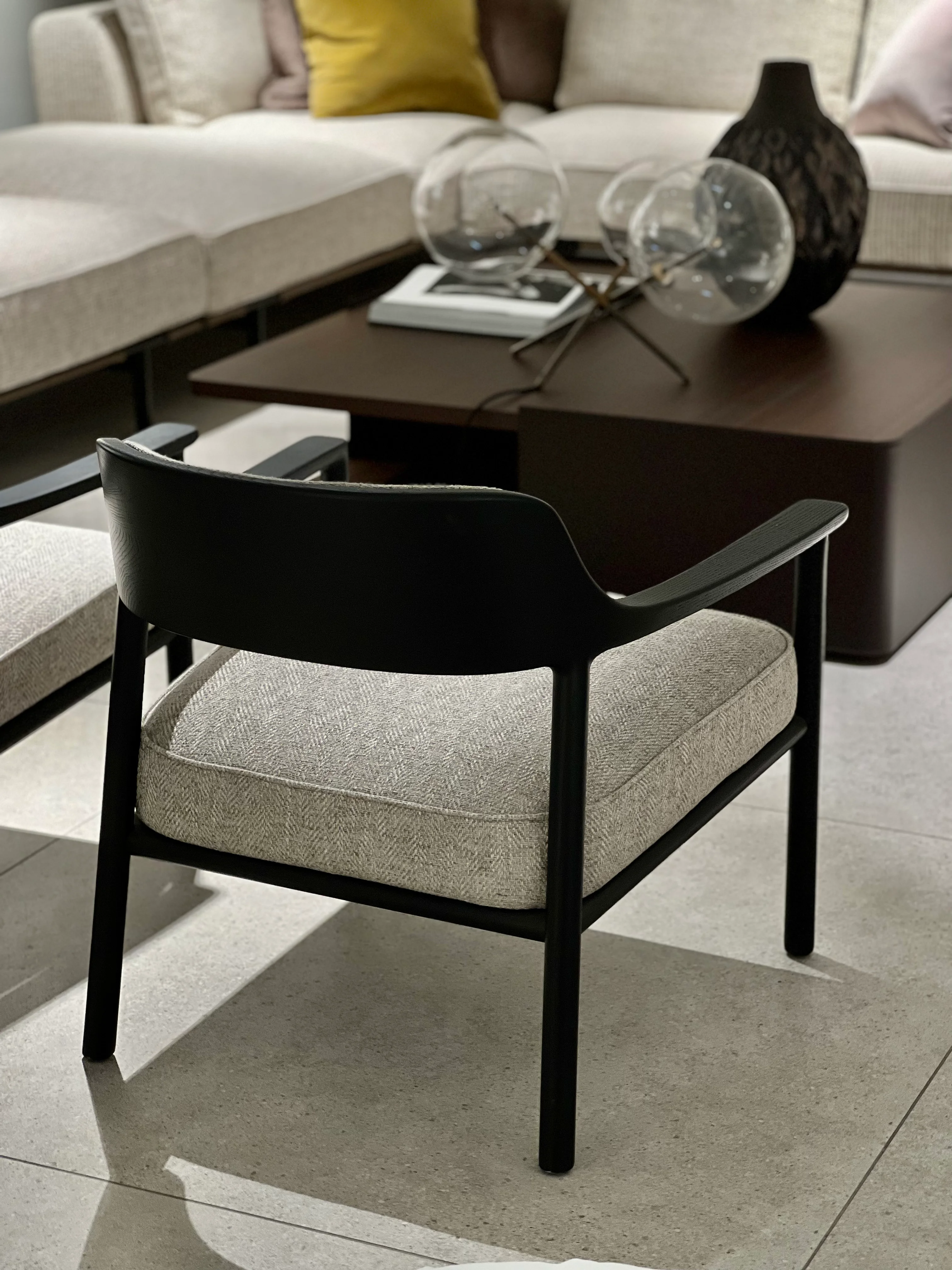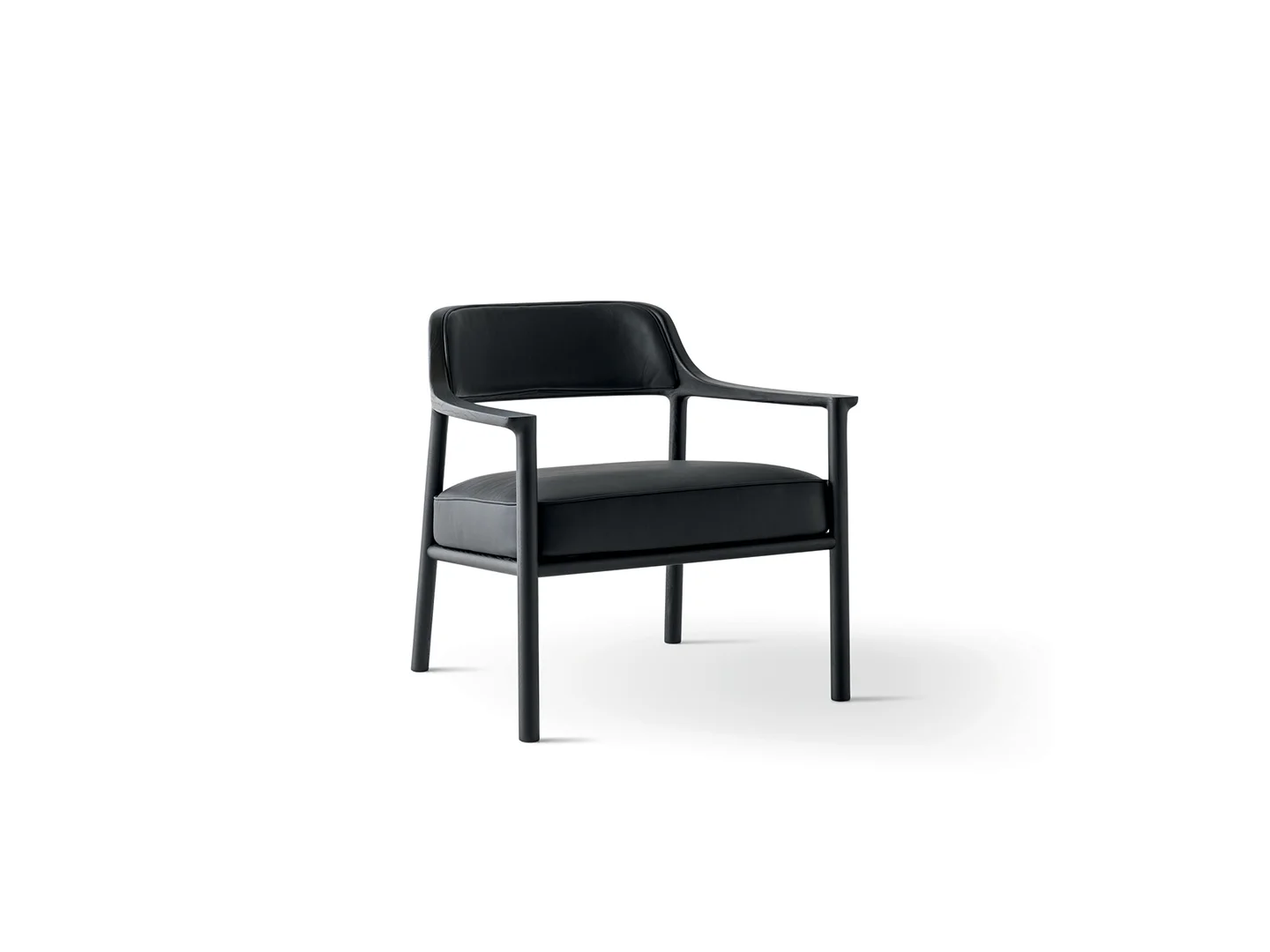Designed for a contemporary and convivial setting, the relaxed style of this little armchair is played out on its contrasts: the essential elegance of the frame contrasts with the softness of the seat.